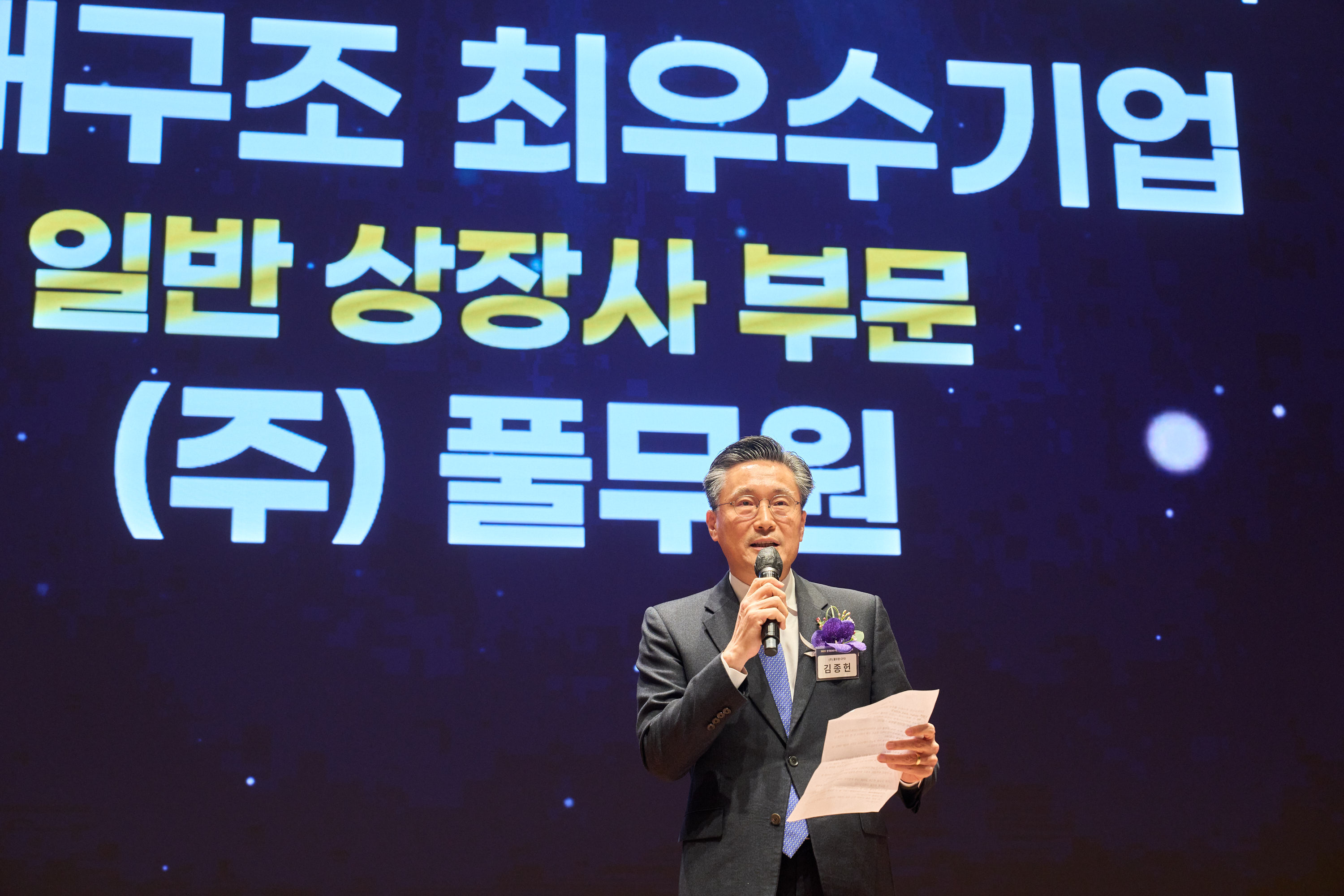 ▲ 4일 서울 여의도 한국거래소에서 열린 한국ESG기준원(KCGS) 주관 ‘2025년 한국ESG기준원 우수기업 시상식’에서 풀무원 김종헌 경영기획실장(사진)이 ‘지배구조 최우수상’ 수상 소감을 발표하고 있다.